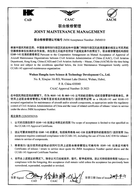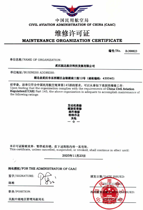 2001年10月 公司獲中國(guó)民航總局授權(quán)的民航維修許可證。